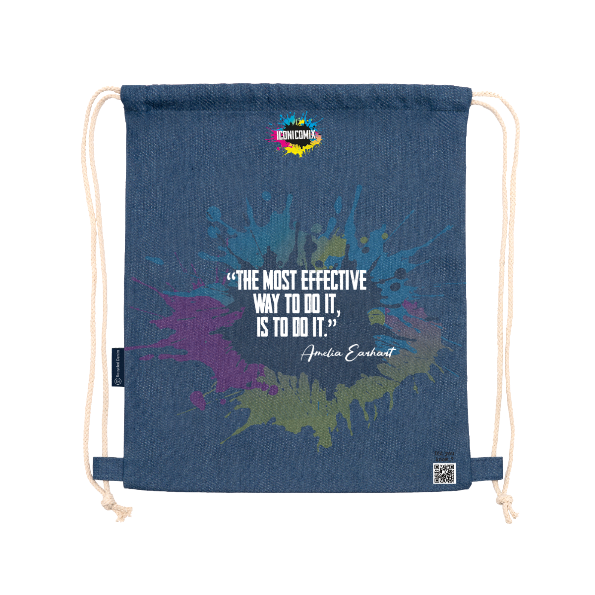 Zaino multiuso realizzato in denim riciclato. Cordoncini regolabili abbinati sul retro, spessore 8 mm. 100% denim, 320 g/m². Dimensioni: 36 cm / 42 cm .
