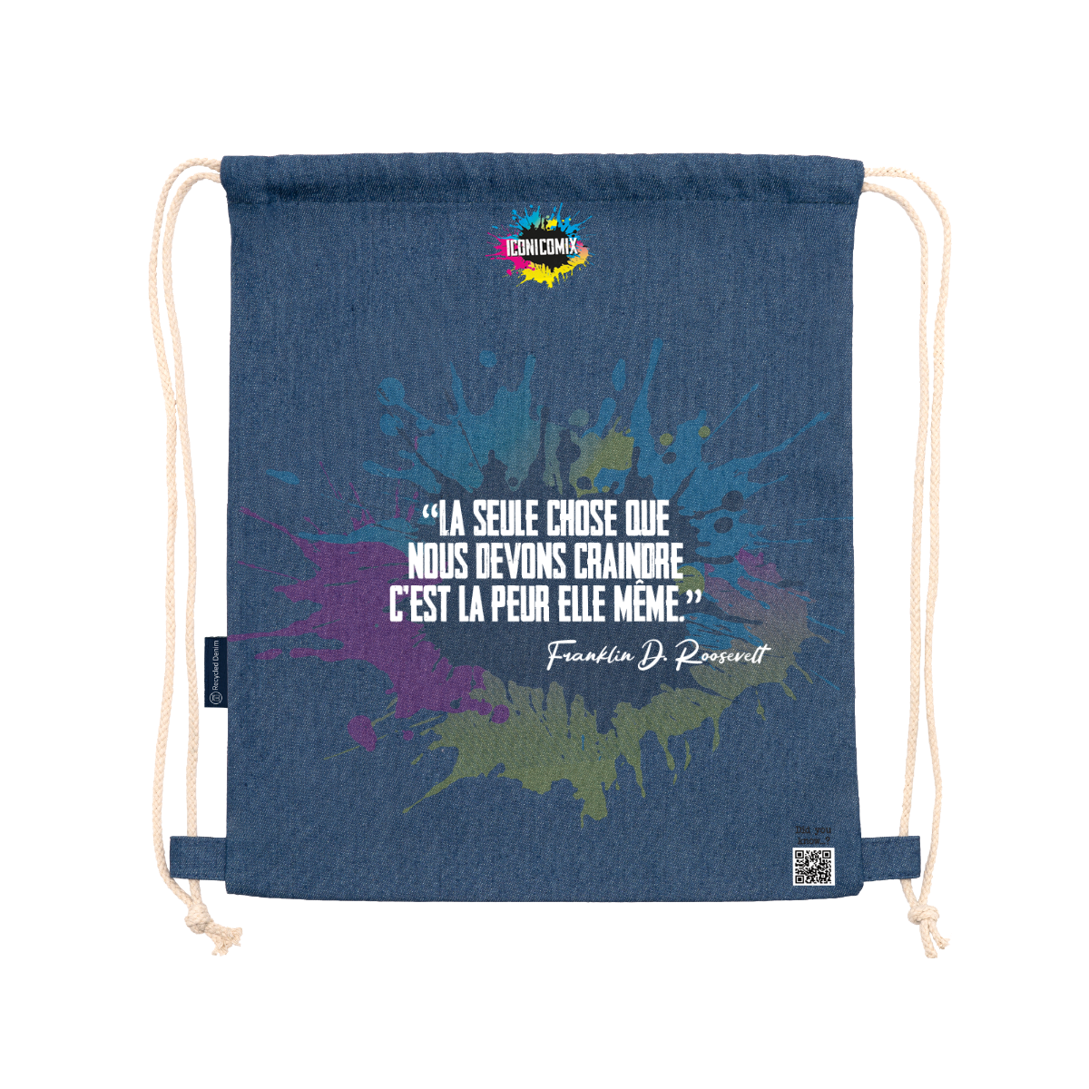 Mochila multiusos fabricada con denim reciclado. Cordones ajustables a juego en la parte trasera, 8 mm de grosor. 100 % denim, 320 g/m². Dimensiones: 36 cm / 42 cm.