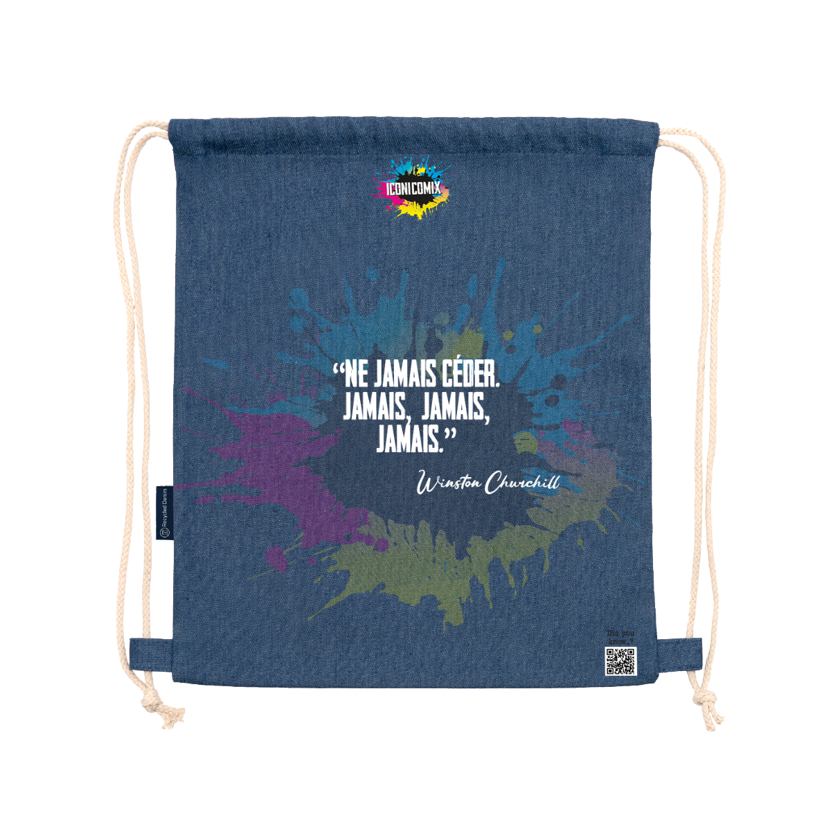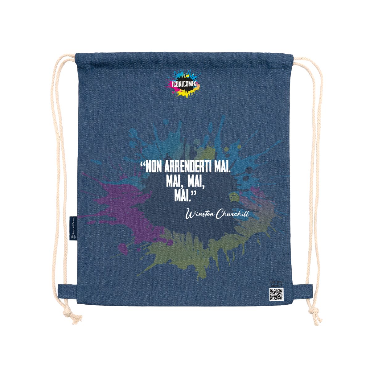 Zaino multiuso realizzato in denim riciclato. Cordoncini regolabili abbinati sul retro, spessore 8 mm. 100% denim, 320 g/m². Dimensioni: 36 cm / 42 cm .