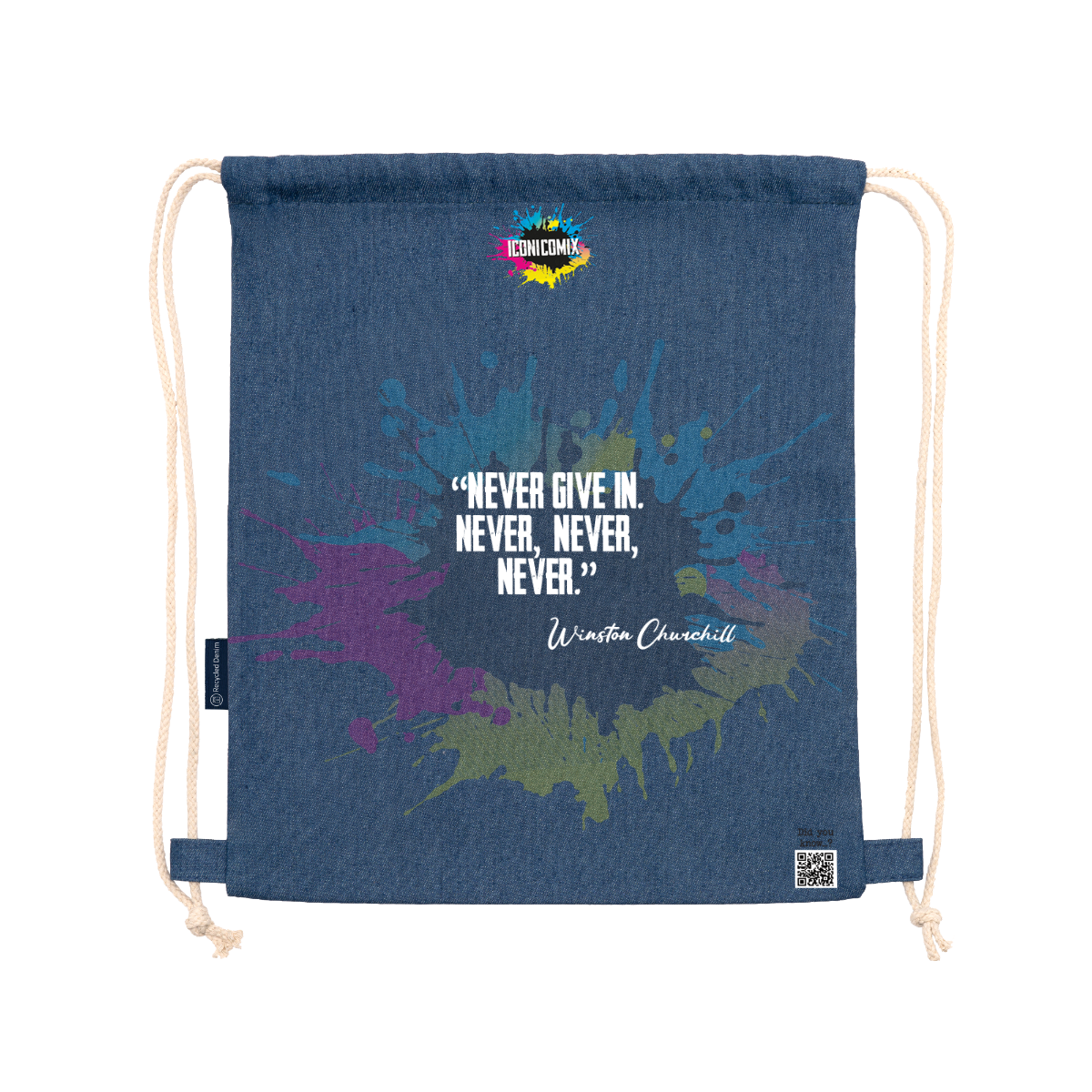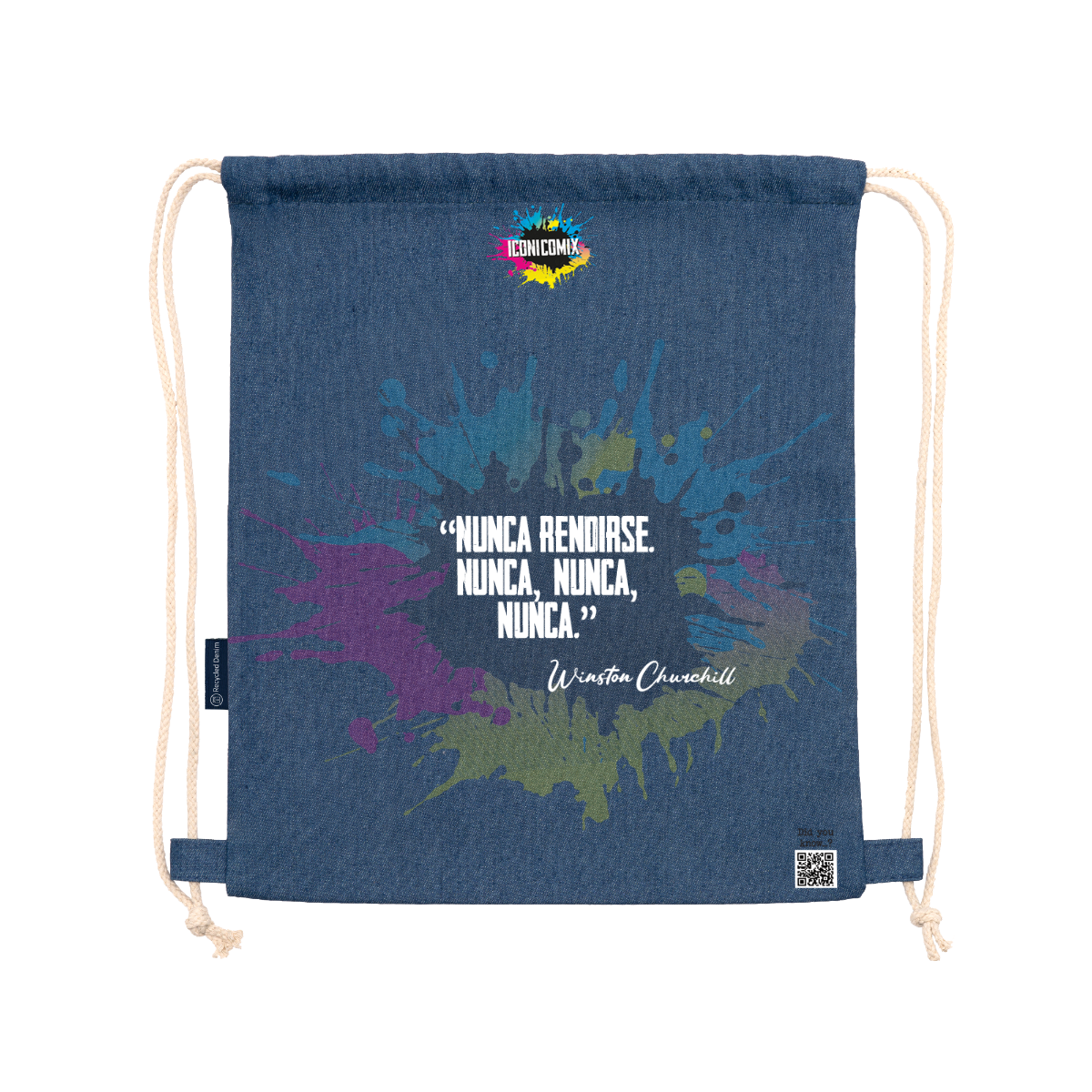 Mochila multiusos fabricada con denim reciclado. Cordones ajustables a juego en la parte trasera, 8 mm de grosor. 100 % denim, 320 g/m². Dimensiones: 36 cm / 42 cm.