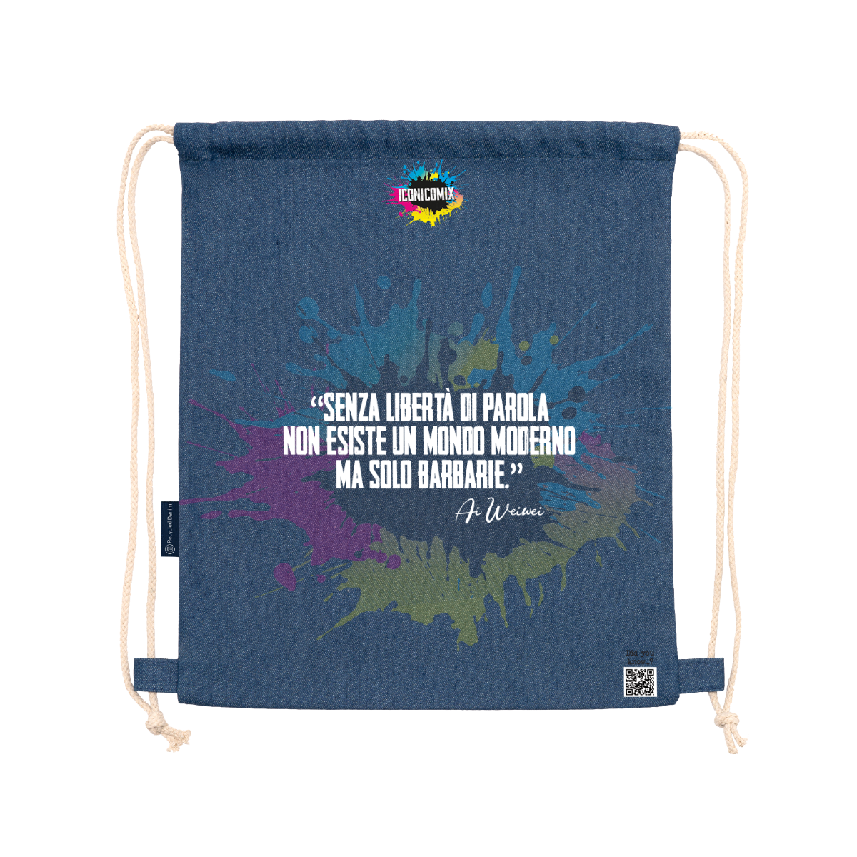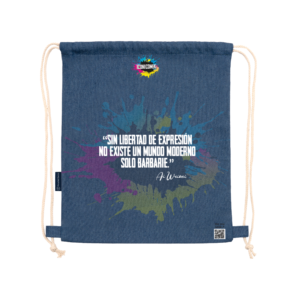 Zaino multiuso realizzato in denim riciclato. Cordoncini regolabili abbinati sul retro, spessore 8 mm. 100% denim, 320 g/m². Dimensioni: 36 cm / 42 cm .