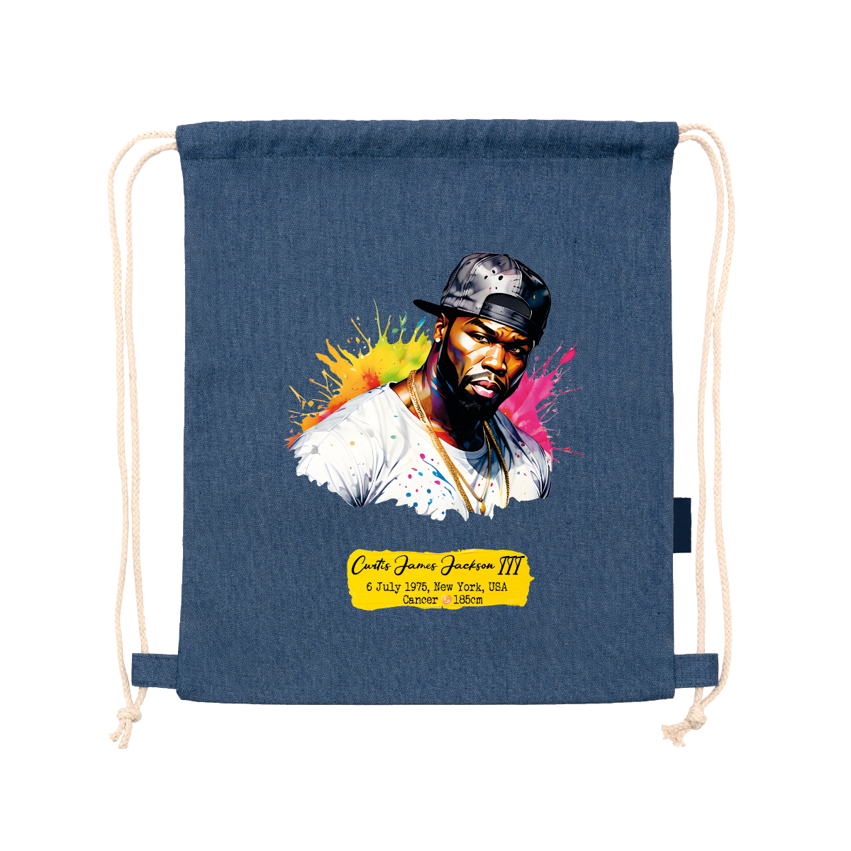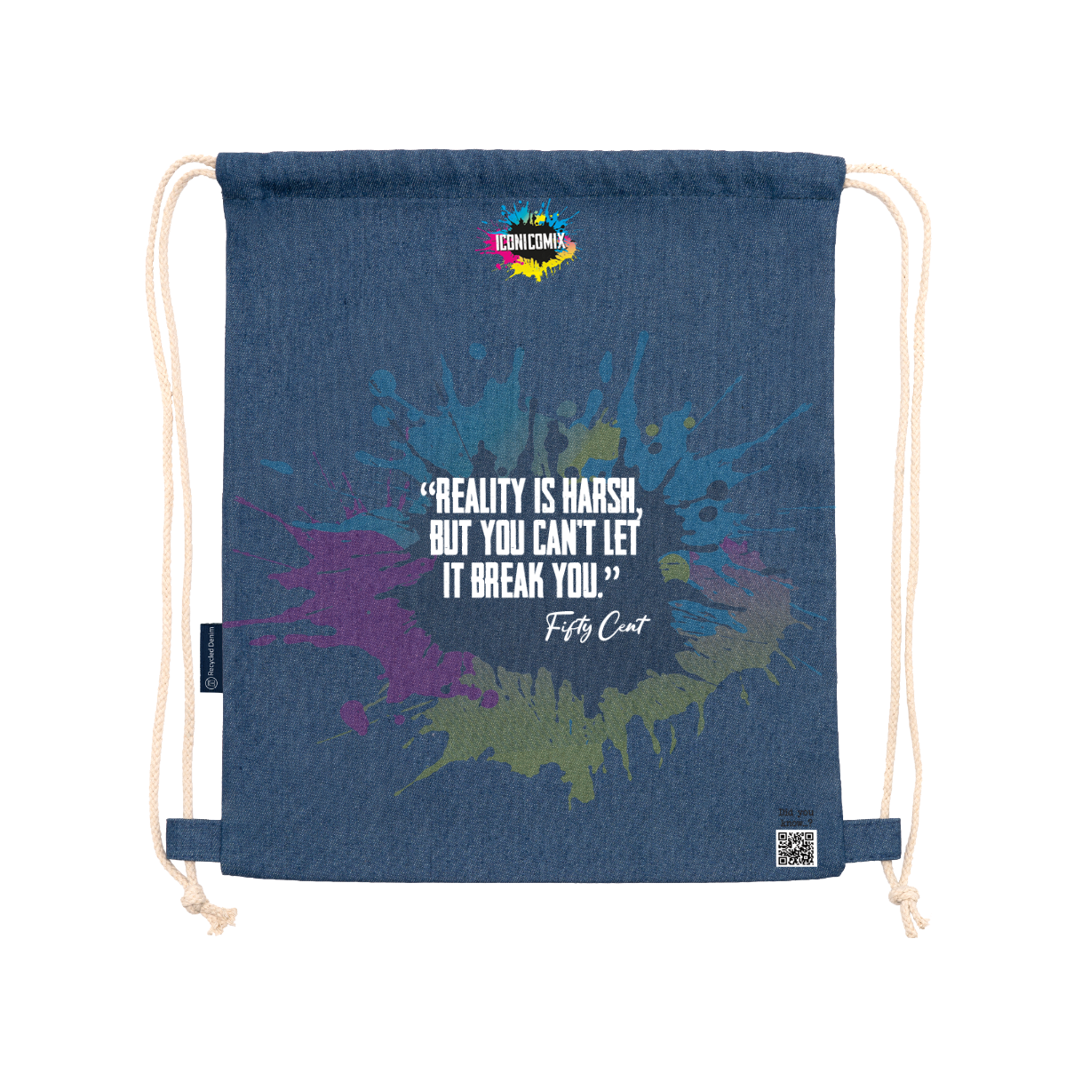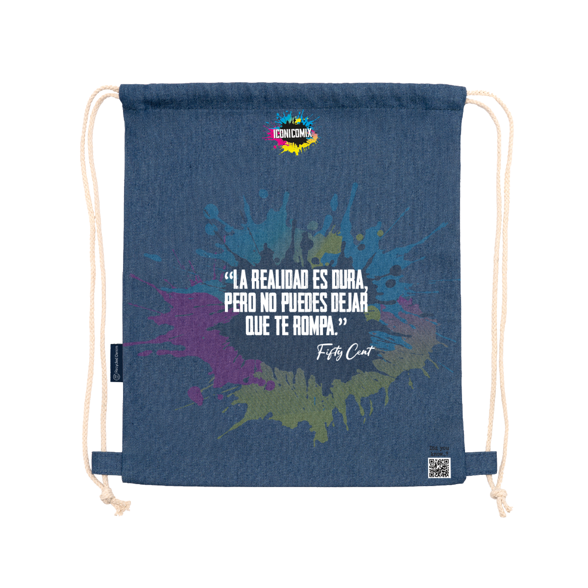 Zaino multiuso realizzato in denim riciclato. Cordoncini regolabili abbinati sul retro, spessore 8 mm. 100% denim, 320 g/m². Dimensioni: 36 cm / 42 cm .