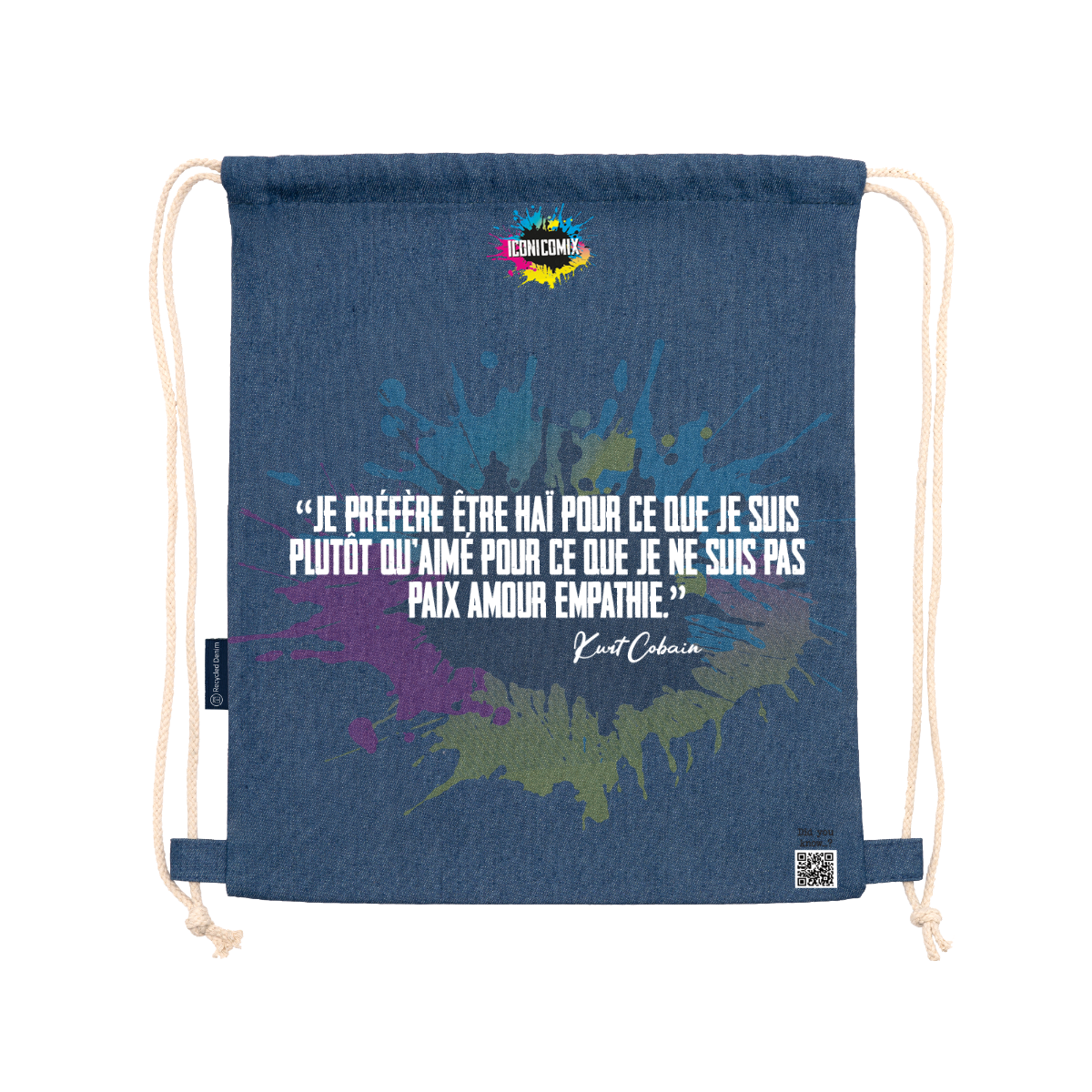 Zaino multiuso realizzato in denim riciclato. Cordoncini regolabili abbinati sul retro, spessore 8 mm. 100% denim, 320 g/m². Dimensioni: 36 cm / 42 cm .