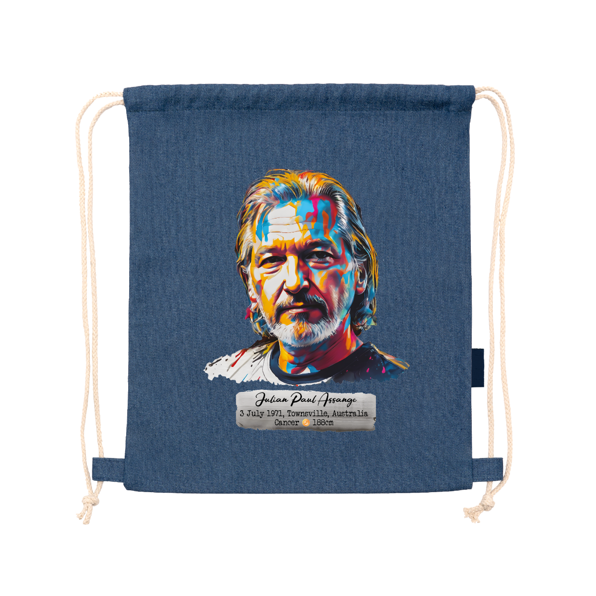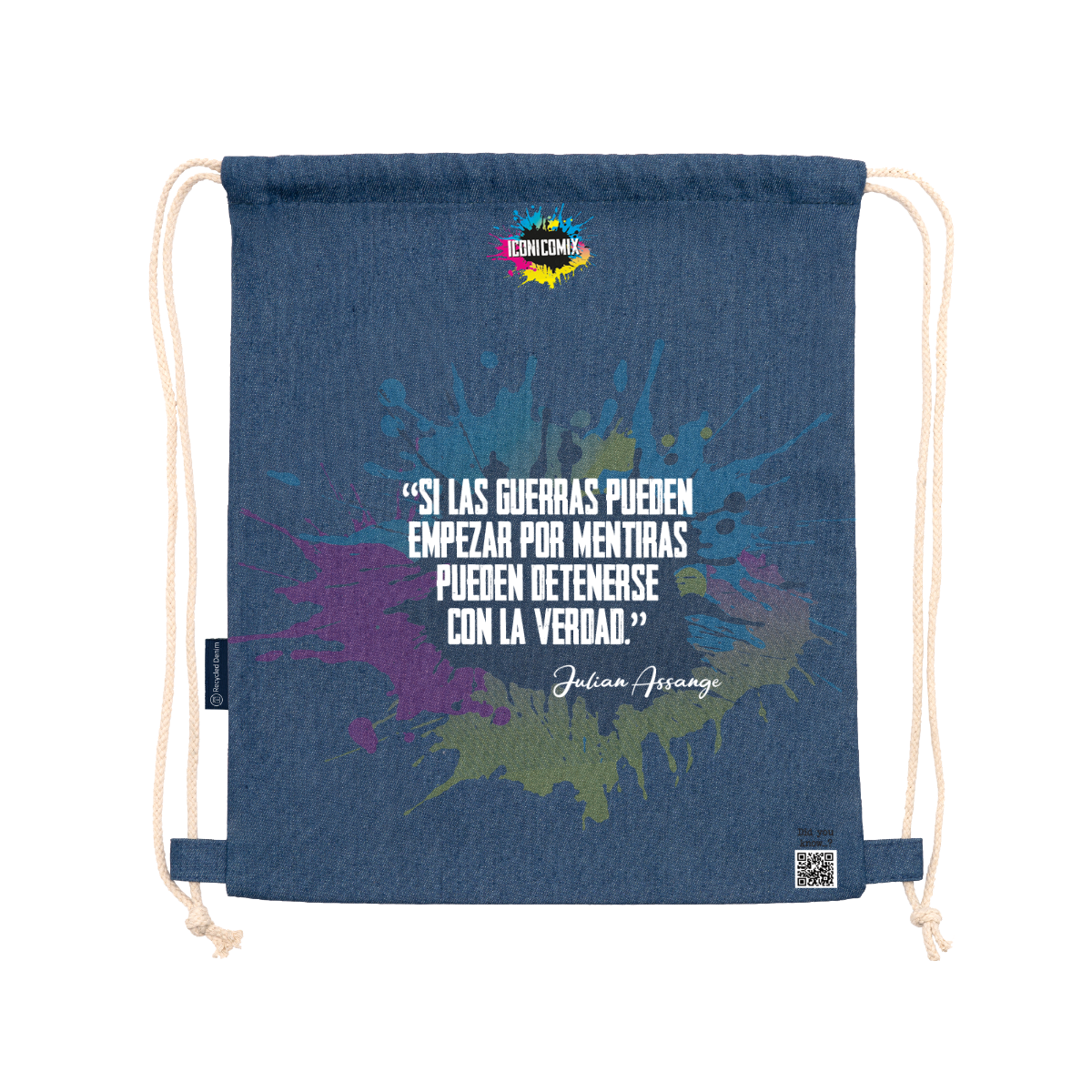 Zaino multiuso realizzato in denim riciclato. Cordoncini regolabili abbinati sul retro, spessore 8 mm. 100% denim, 320 g/m². Dimensioni: 36 cm / 42 cm .