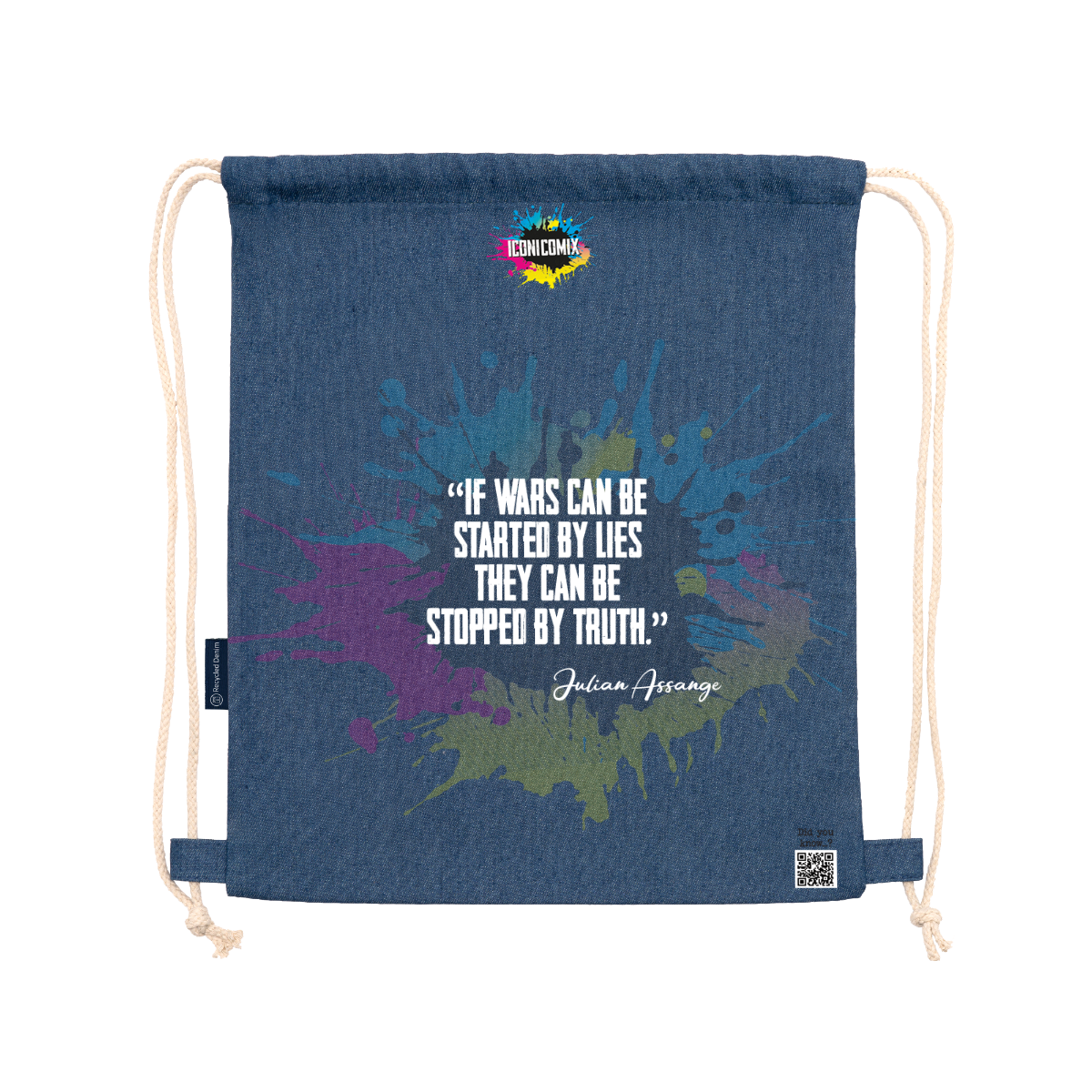 Zaino multiuso realizzato in denim riciclato. Cordoncini regolabili abbinati sul retro, spessore 8 mm. 100% denim, 320 g/m². Dimensioni: 36 cm / 42 cm .