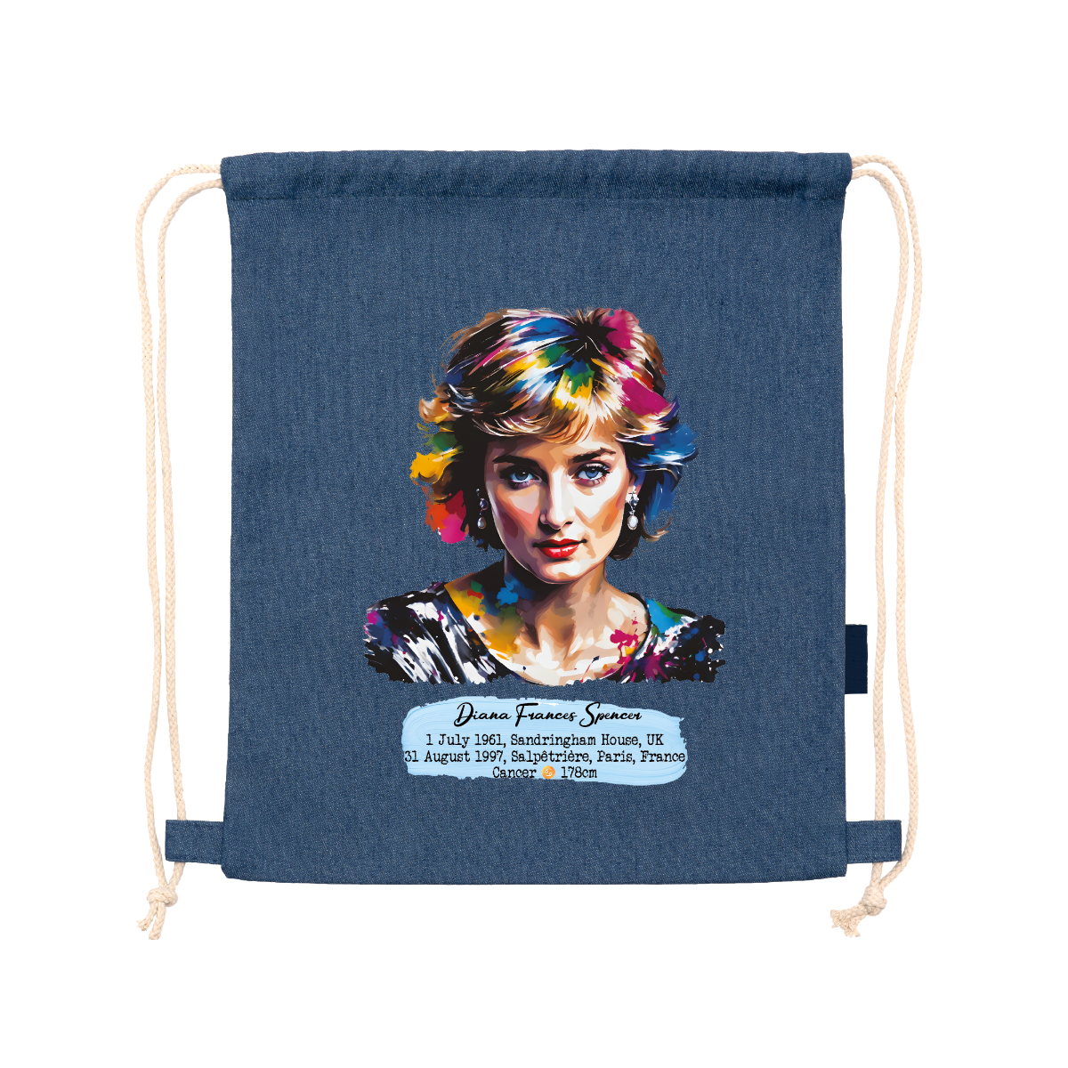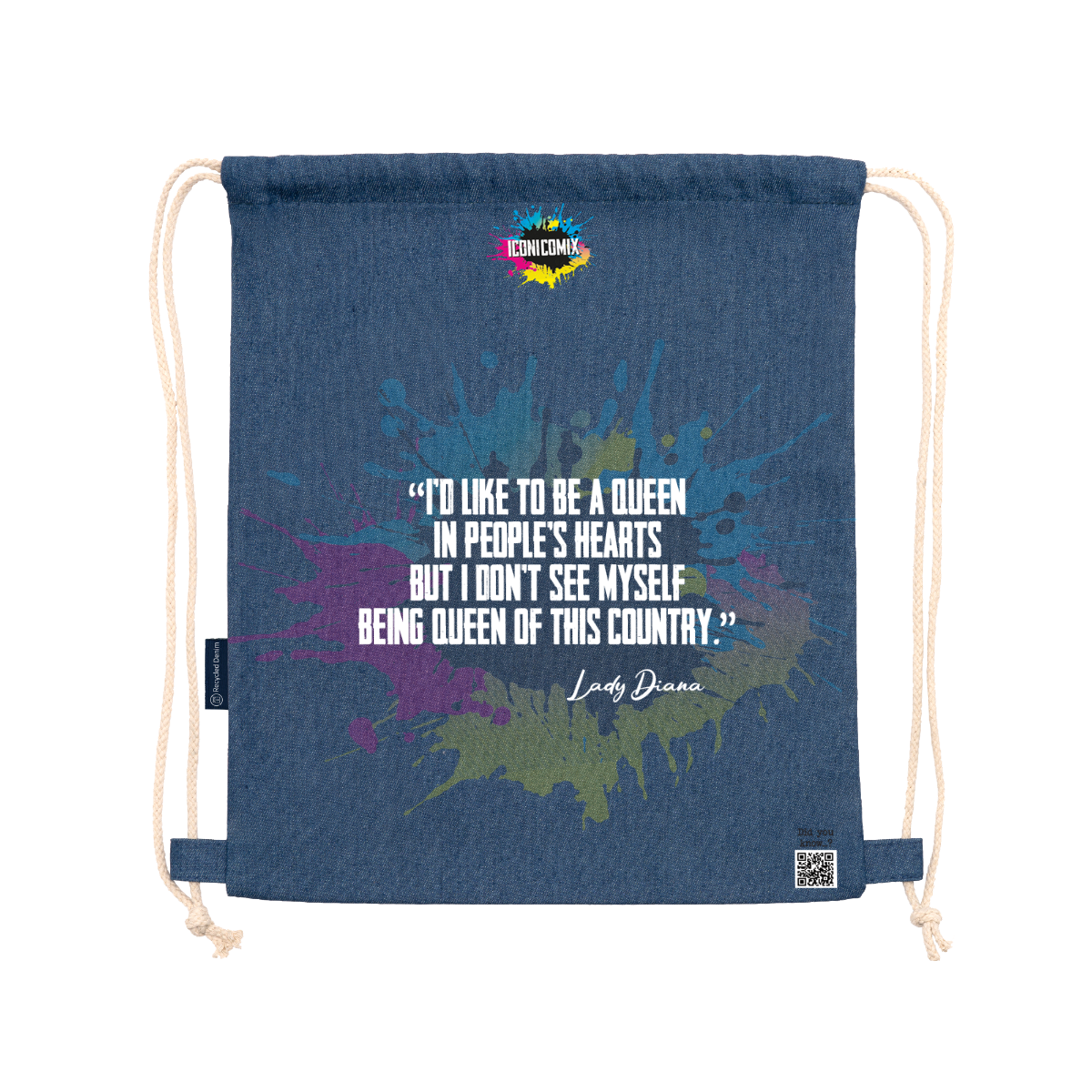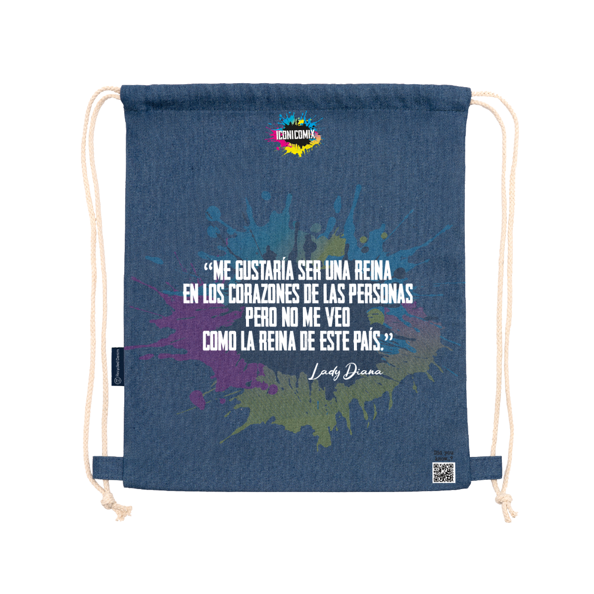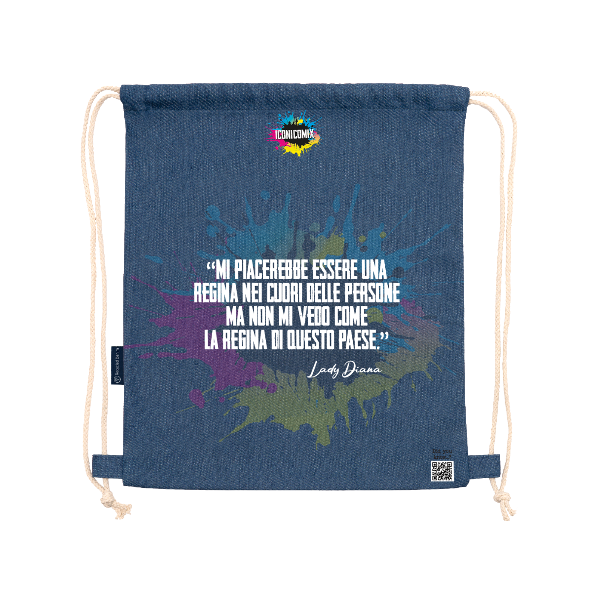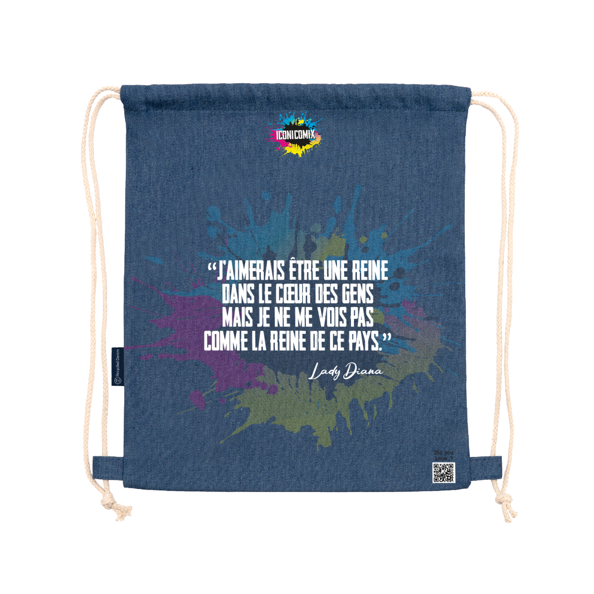 Sac à dos polyvalent en denim recyclé. Cordons de serrage réglables assortis à l'arrière, épaisseur 8 mm. 100 % denim, 320 g/m². Dimensions : 36 cm / 42 cm.