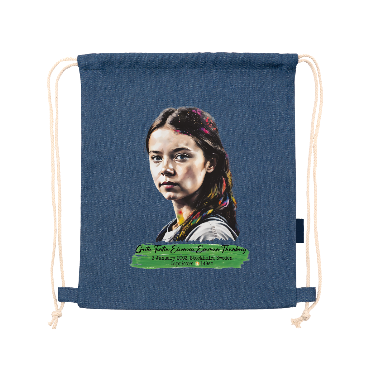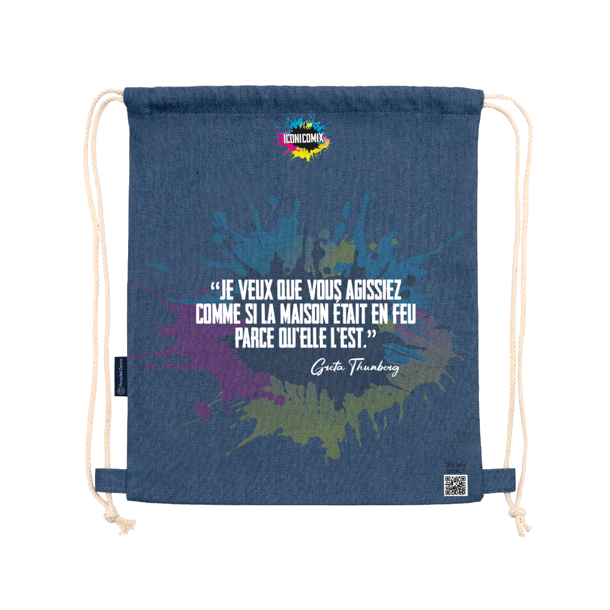 Zaino multiuso realizzato in denim riciclato. Cordoncini regolabili abbinati sul retro, spessore 8 mm. 100% denim, 320 g/m². Dimensioni: 36 cm / 42 cm .