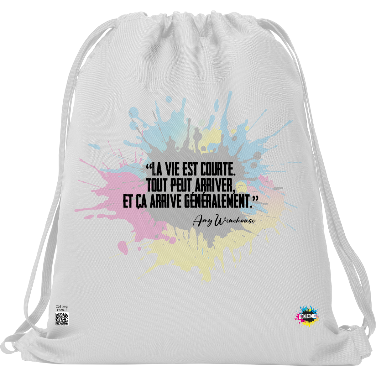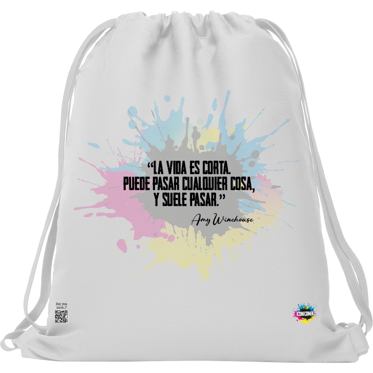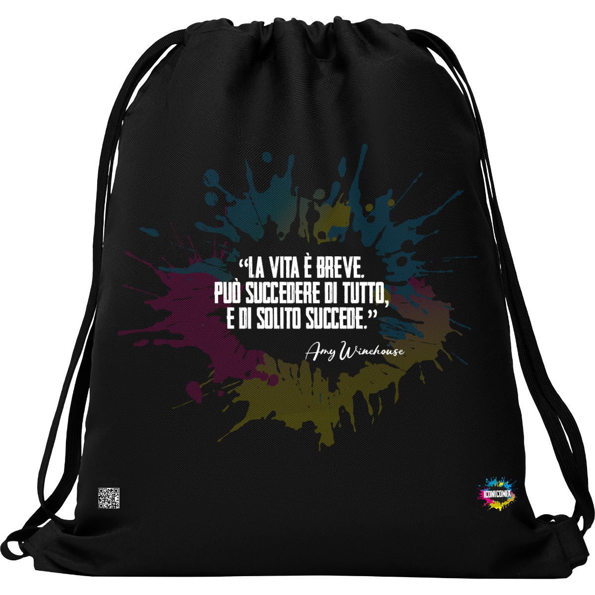 In ogni nostra grafica è presente anche un QR code che reindirizza al sito iconicomix.com, alla pagina ufficiale dell’icona che hai scelto. Una porta digitale che racconta la sua storia, le sue frasi e il suo mondo.