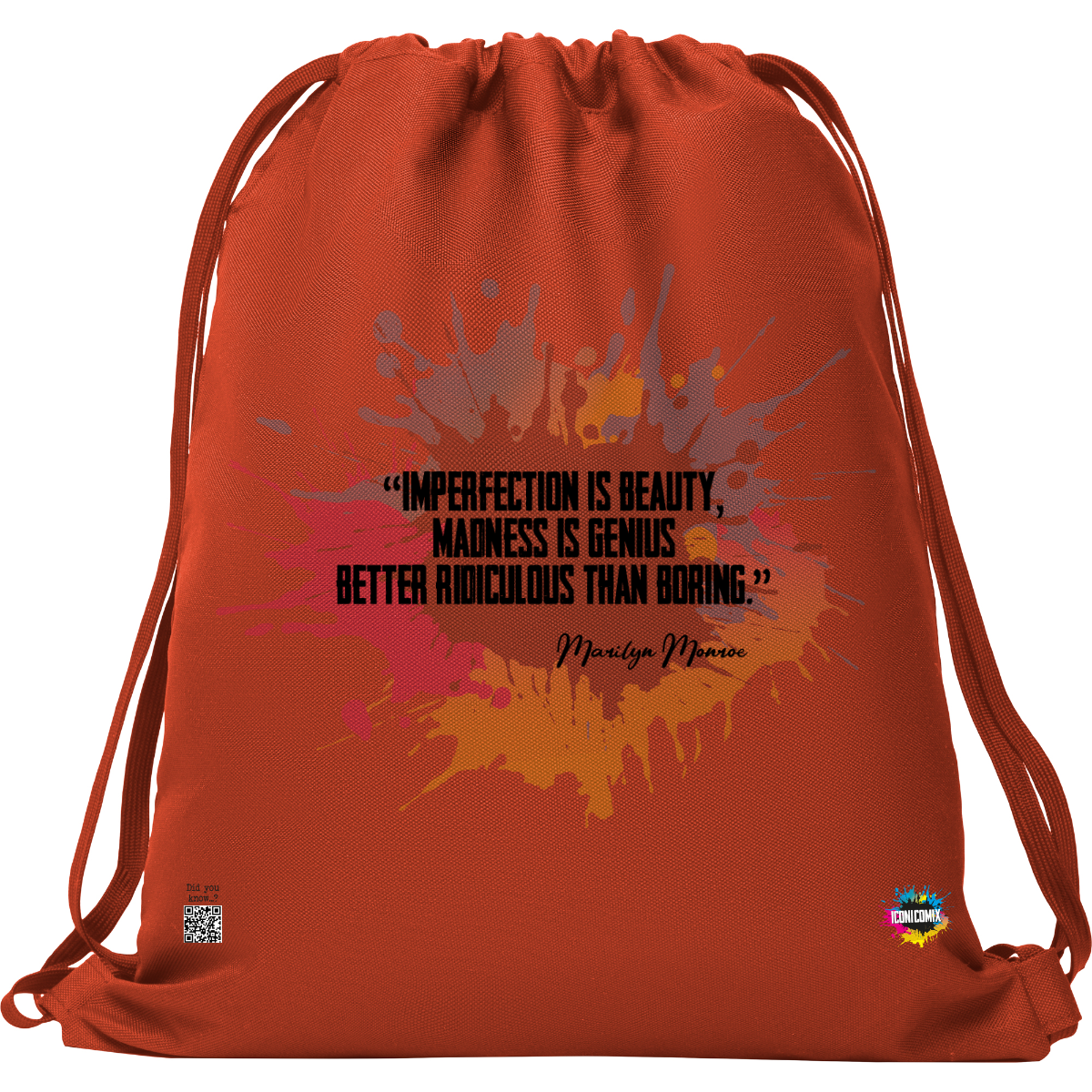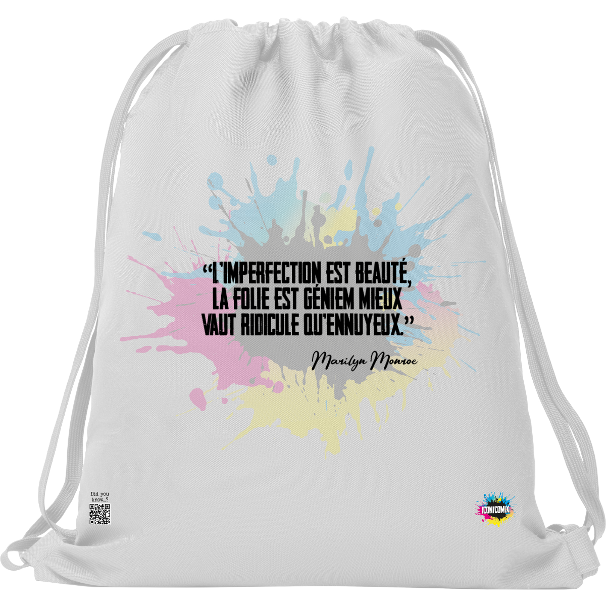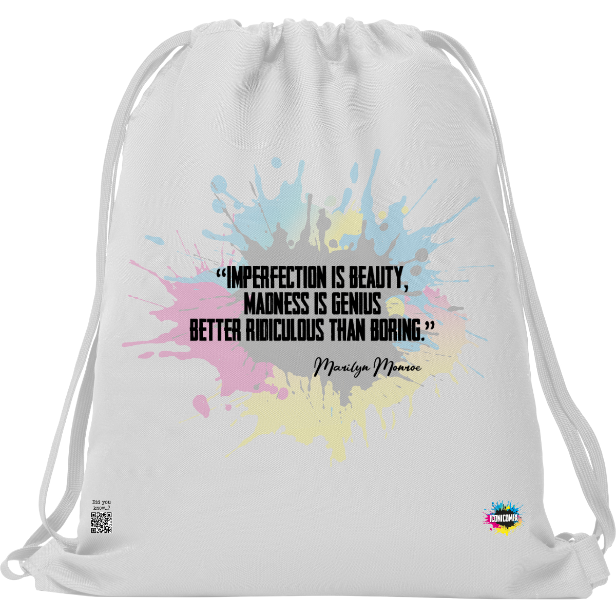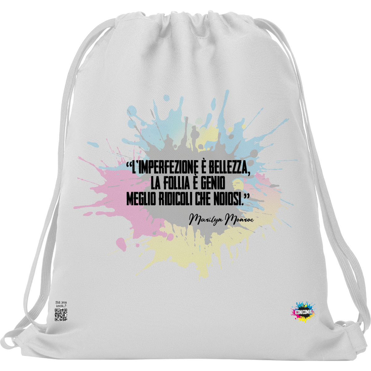 In ogni nostra grafica è presente anche un QR code che reindirizza al sito iconicomix.com, alla pagina ufficiale dell’icona che hai scelto. Una porta digitale che racconta la sua storia, le sue frasi e il suo mondo.